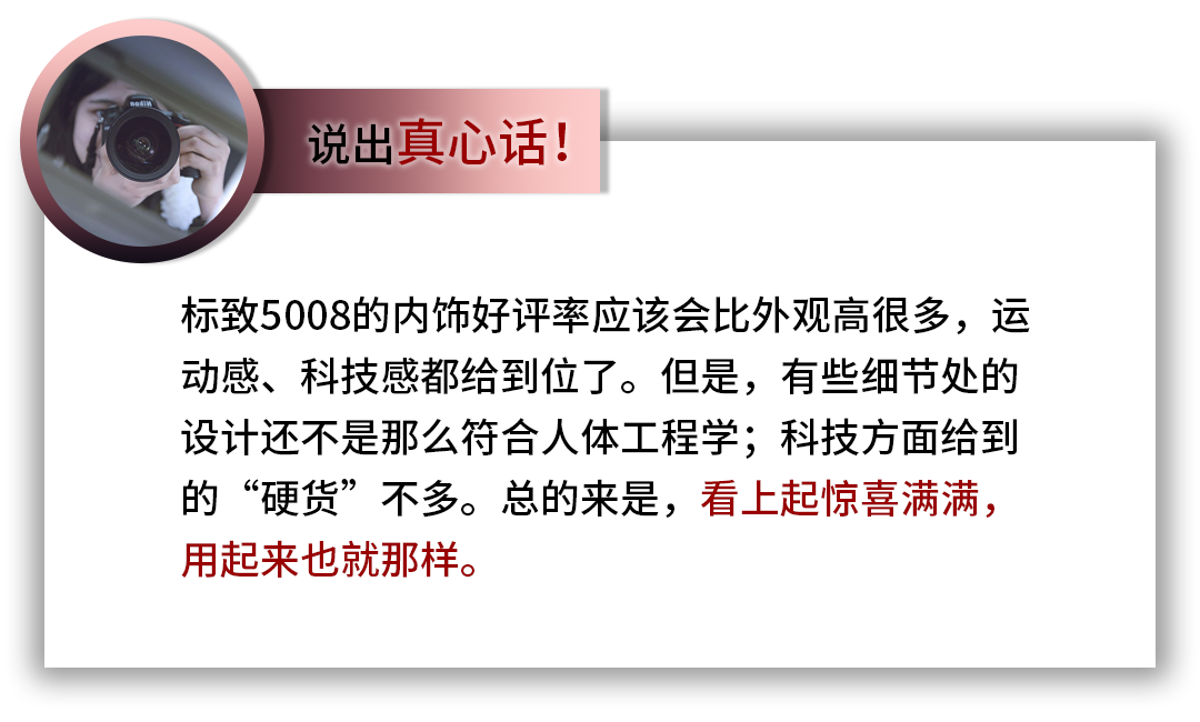 静态体验过标致5008后,小编觉得,人嘛,就是不能贪心!标致5008就比较好地做到这一点。它想要做到个性,想要增添趣味,想要与众不同,在一些地方上就肯定有所牺牲。但这并不代表它不接地气!想想,20万出头就能买到一台设计不赖、配置不低、空间功大于过的7座SUV,还是挺值得的。