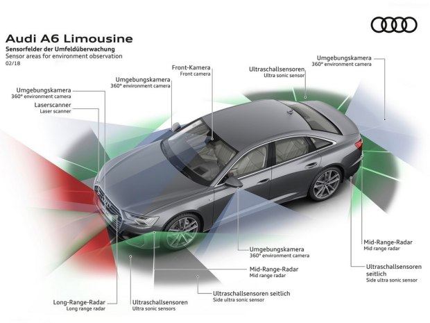 全新A6的停车位/车库辅助功能可以令车辆自动完成停车位或车库的出入,驾驶员甚至可以在车外使用myAudi App进行这一步骤的操作,这两项功能均隶属于三个选装包之一的停车辅助选装包。除此之外,另外两个选装包还包括城市辅助包和旅行辅助包,提供自适应巡航、车道辅助保持、节油辅助等功能。全部驾驶辅助系统均依托于奥迪的高科技模块——中央驾驶员辅助控制器(zFAS),它基于全车各类传感器反馈的信号进行不间断运算,这些传感器最多包括5颗雷达、5颗摄像头、12颗超声波传感器,以及1颗激光雷达。