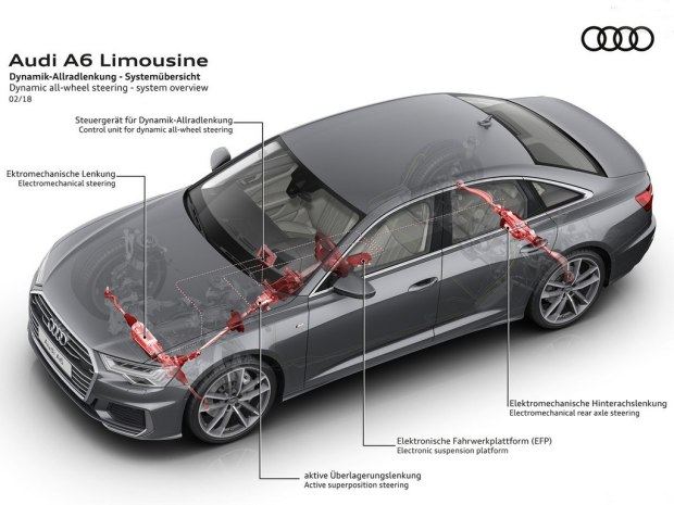 底盘及悬架方面,全新A6提供了可变转向比、四轮转向系统、铝制悬架部件,以及四种不同级别的减振器,从而提升了车辆的整体操控感受和驾乘舒适性。其中,全新A6搭载的动态全轮转向系统和可变转向比提升了车辆的机动性,在不同的车速下,全新A6的转向比范围为9.5:1-16.5:1,后轮转向幅度最大可达到5°。与其它带有四轮转向系统的车辆一样,低速状态转弯时,车辆后轮与前轮的指向相反,从而可以帮助缩小转弯半径,最小可缩至5.55米。对于一辆中大型车来说,5.55米的转向半径是十分难得的,这将大大提升车辆在狭窄区域的灵活性;而在中高速状态下转向(并线)时,后轮方向将与前轮相同,从而提升车辆的行驶稳定性和驾乘舒适性。