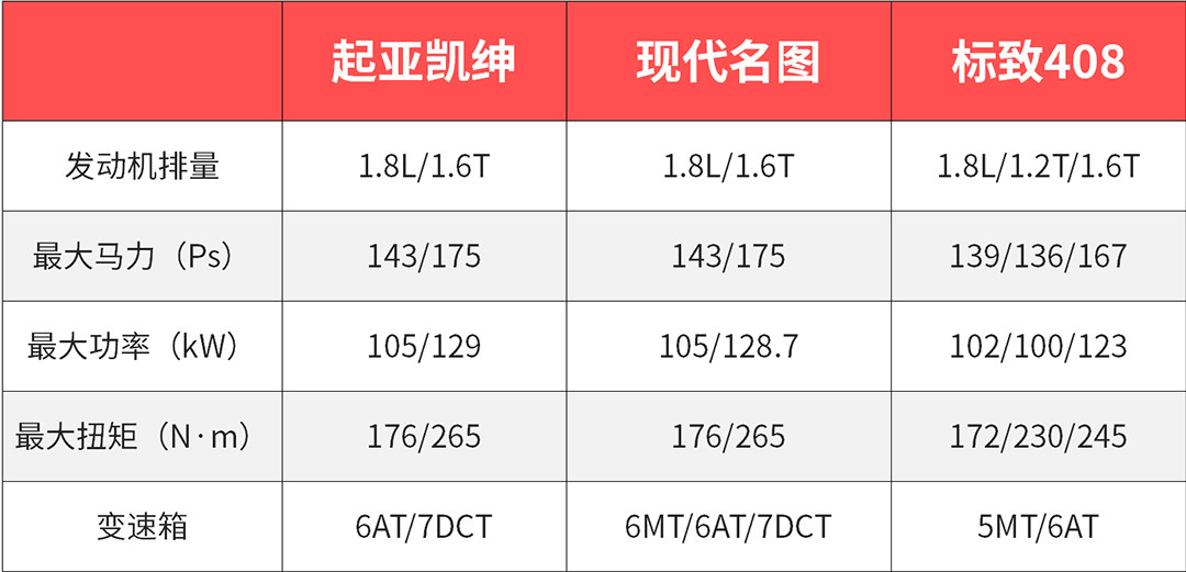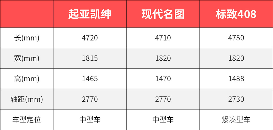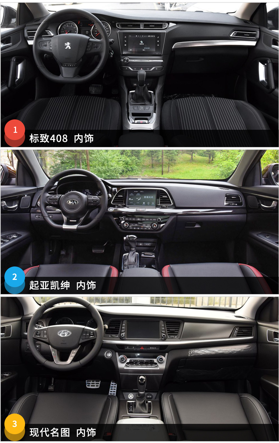 对于三车而言,在造型方面三者均采用上了各自的家族式设计,像在上一年现代名图以及起亚K4纷纷进行了中期改款,而后者也正式命名为起亚凯绅,两者在造型方面依然传承到韩系车一向精致的风格,配以两者是入门级中型车的定位,在等级方面也比同价位的合资紧凑型车型高上半个等级;而对于标致408而言,虽然许久没更新换代,但是整体的设计依然是走在潮流的尖端,不难发现的是,其实标致408的车身尺寸是三款车型当中体型最大的,但碍于轴距问题,它依然定位在紧凑型车一列。