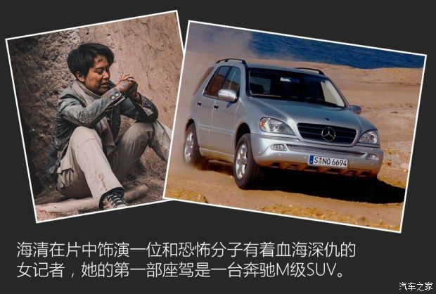 按出场顺序说吧!海清在片中饰演一位专门调查恐怖分子的法籍华裔女记者,她的驻地是摩洛哥卡萨布兰卡,而她在这里的座驾是一部奔驰M级(GLE的前身),这是一部中大型豪华SUV,兼顾了舒适性和一定的越野能力,和战地记者的身份比较契合。可惜这部车在片中出现不久就去“领盒饭”了,戏份不太多。