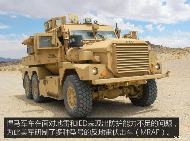 话说伊拉克战争中,美军悍马车队经常遭遇游击队地雷和简易爆炸装置(IED)的袭击,伤亡惨重。为了解决悍马防护能力不足的问题。美国人开发出了这种反地雷伏击车,它特殊的底盘设计和厚厚的装甲可以在一定程度上抵御地雷和IED的袭击。