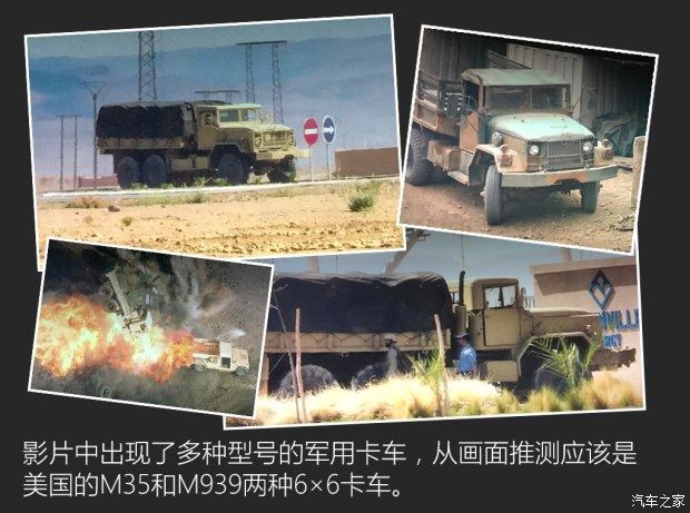 在蛟龙突击队所在的政府军车队里以及叛军基地,都能看到不少军用卡车的身影,这些6×6的大家伙在影片中主要负责运输物资、搭载狙击手以及被恐怖分子炸上天。卡车出现的时间不多,根据外观和身量猜测,它们应该是美国产的M35和M939军用卡车。