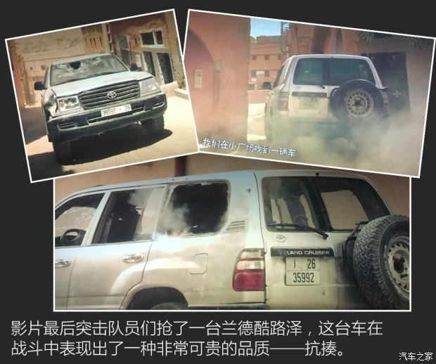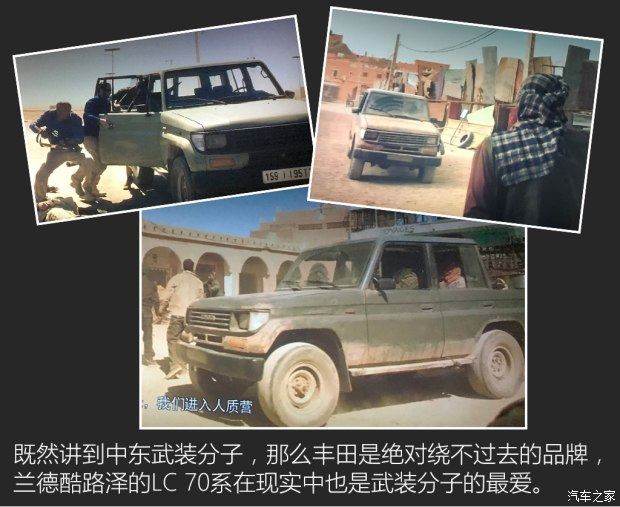 当然,导演并没有忘了丰田,其实任何涉及中东武装分子的影片,都是没法绕过丰田皮卡的。影片中除了初代揽胜之外,最多的就是丰田兰德酷路泽(LC 70系列)皮卡了。LC 70系列兰德酷路泽诞生于1984年,至今仍在生产,是家族中最长寿的成员,同时也是中东人民最喜爱的车型之一。