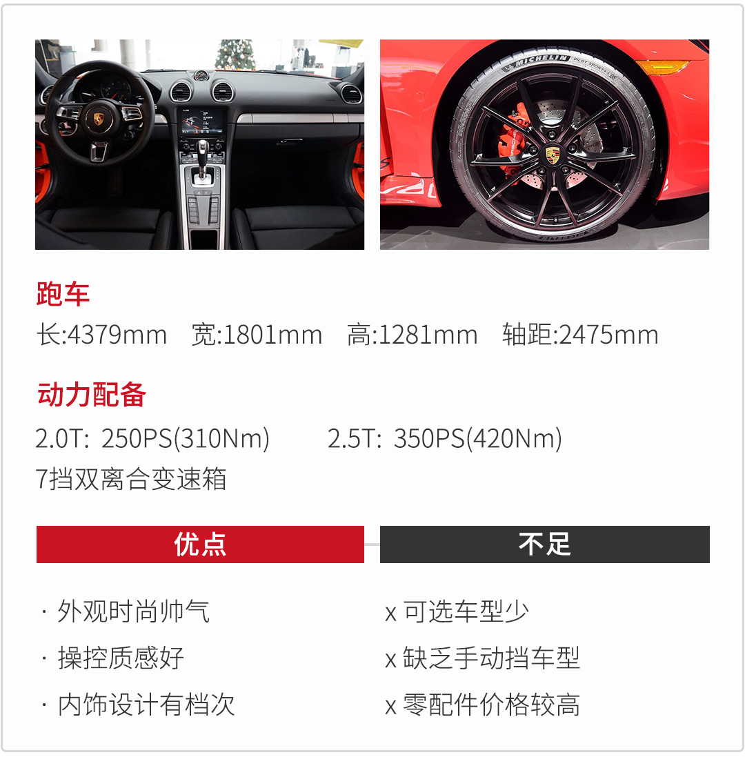 2.5T虽然也是四缸发动机,但零百加速时间也能有4.4s左右。718有硬顶和软顶可选,软顶在去到一些少车的环境确实能较好地与大自然接触。不过,也要忍受噪音偏大的缺点。