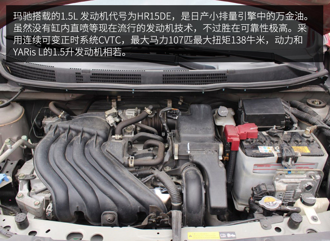 现售的马驰搭载1.2L和1.5L的发动机。说到这副1.5L的HR15DE,可谓是日产小排量发动机的“万金油”。搭载在玛驰上的HR15DE最大马力107匹,最大扭矩138牛米。虽然对着GK5那131匹马力的怪物不能一战,但和雅力士致炫L的发动机输出相比还是不分上下的。百公里油耗6L出头也算是可圈可点。关键是有较轻的车身帮助,即使“仅仅”有107匹发动机,也有相对不错的行驶体验。