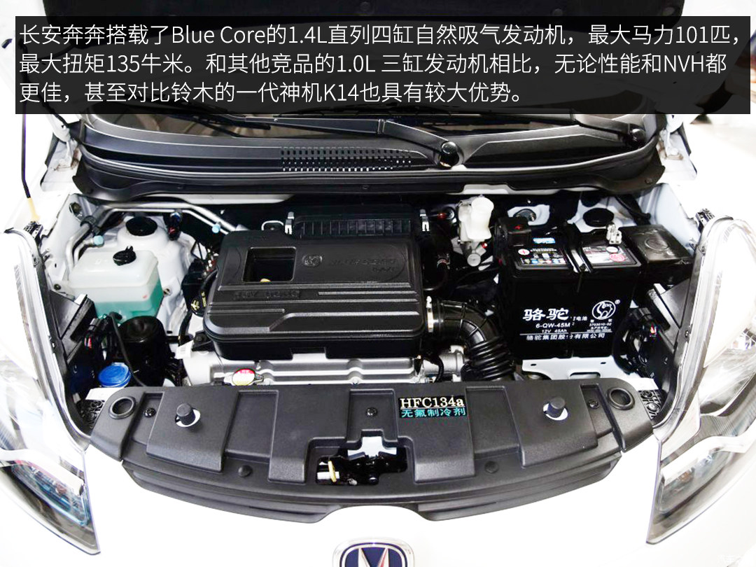 长安奔奔搭载了Blue Core的1.4L直列四缸自然吸气发动机,最大马力101匹,最大扭矩135牛米。相比于其他竞品,这副发动机的最大马力足足有30匹左右的优势,甚至即使面对一些合资品牌的1.5L自然吸气发动机,动力表现也毫不逊色。在车身更轻的长安奔奔来说,动力表现甚至比铃木搭载在北斗星上的神机K14还强,可谓是微型车界的超跑。同样的,这副四缸发动机也没有其他三缸发动机那种烦人的震动,因此也提升了这台精品微型车的行驶质感。
