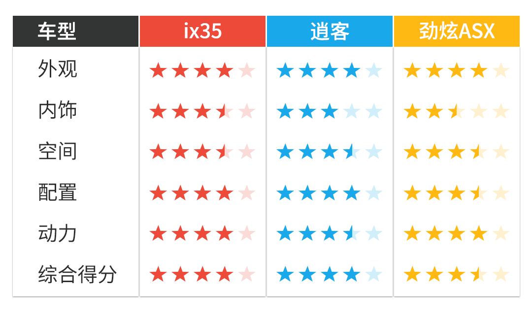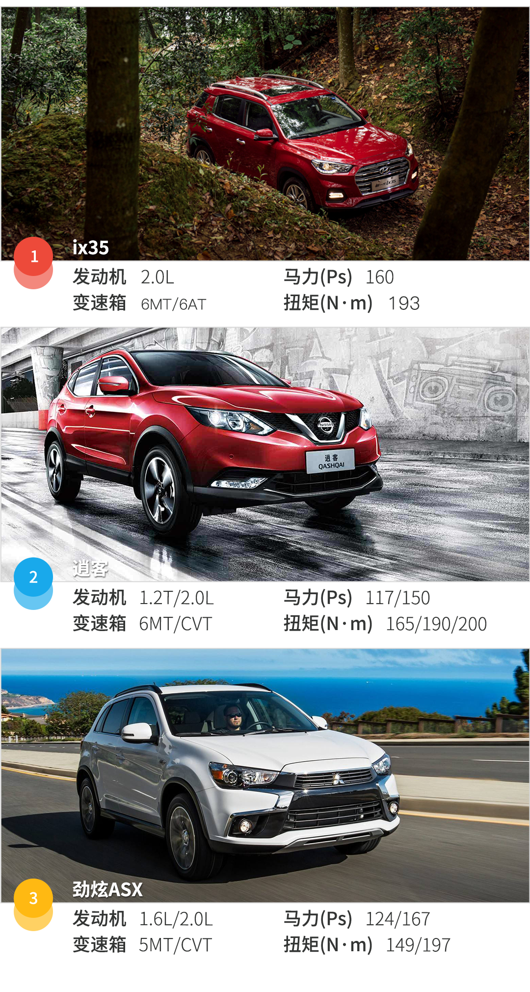 在对比当中,逍客和现代ix35算是平分秋色的,逍客在行驶舒适性方面做得最好,而现代ix35全面表现更加均衡。至于三菱劲炫ASX嘛,虽然整体竞争力不足,但是操控性也算是一大卖点。更重要的一点时,它比较便宜呀!
