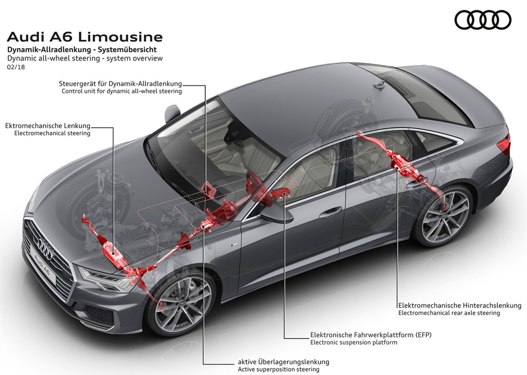 另一点,全新一代A6还配备了后轮主动转向系统(转向幅度最大可达5°),能大幅减小车辆转弯半径,并且能提升高速行驶的稳定性。