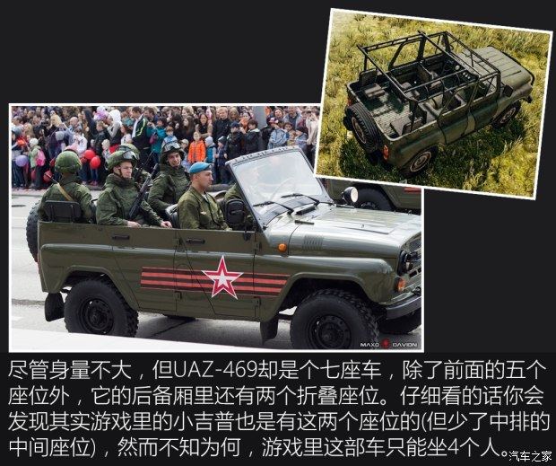 和众多苏式装备一样,UAZ-469粗糙但可靠,发动机舱里的2.5L直列四缸发动机最大功率76马力,与之匹配的是一部4速手动变速箱,并具有低速和高速四驱模式,铺装路面最高速度和游戏里一样,100km/h。值得一提的是,和游戏中只能乘坐4人的设定不同,现实中UAZ-469核定载员7人(包括后备厢的两个座位)。