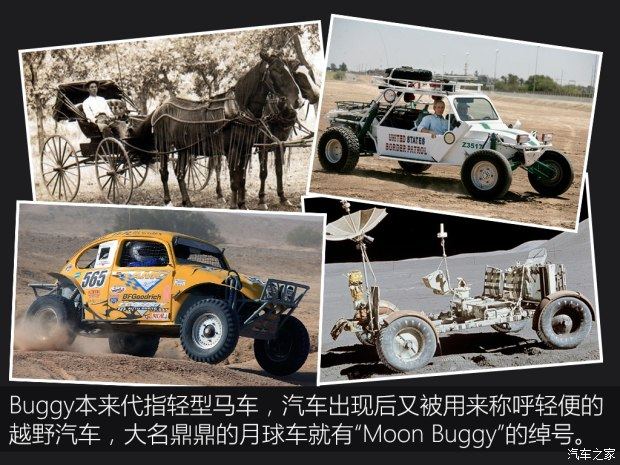 和游戏里的其他车型不同,Buggy车并非一个品牌或车型,而是一个车型种类,其实Buggy这个词最早指的是一种两座轻型马车,后来被汽车工业借鉴过来,代表的是轻型汽车。这种车都是去除了驾驶之外的一切功能的工具车,比如在甲壳虫上改装的Baja Bug,再比如阿波罗登月中的月球车。