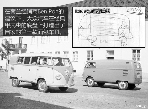 二战刚结束时,大众汽车恢复民用车生产,它当时的产品有且仅有一款车,就是费迪南德·保时捷博士在战前设计的甲壳虫(Type 1)。生产期间,工人们用几部甲壳虫底盘改成了内部运输用的小货车,后来一位荷兰经销商到大众公司谈生意时看到了这辆即兴创作的小车,觉得这东西或许有市场,于是建议大众量产一台厢型车。