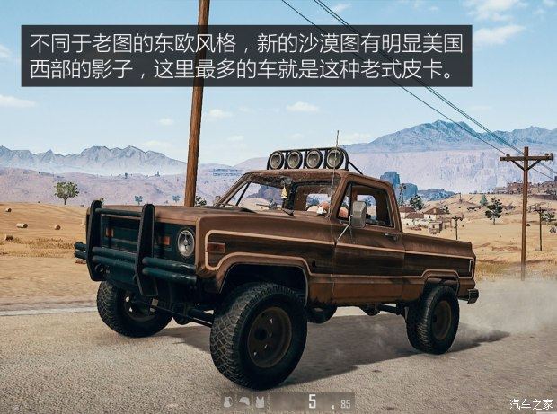 既然他们把其他车都挑完了,我也就只能说说沙漠图里的皮卡了。这台皮卡相当于老图中的UAZ吉普车,各方面实力比较均衡,离地间隙很高,通过能力不俗,翻山越岭不在话下,不过也是由于底盘高,趴在车后面找掩护就不是很理想了。