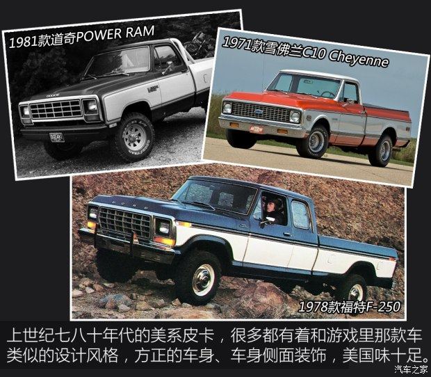 由于长了一张“大众脸”,“吃鸡”游戏中的这部皮卡很难看出是哪个品牌旗下的车型,不过依旧能从它的身上嗅到很浓厚的美国味儿,比如魁梧的造型,硬朗的线条,以及贯穿车身侧面宽宽的双色装饰条(其中一版还是仿木纹贴片),这些都是上世纪七八十年代美系皮卡惯用的设计语言,当年的福特F系列、雪佛兰C系列等很多皮卡都是这副样子。