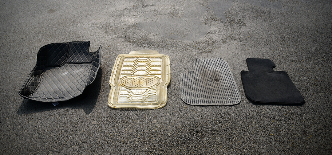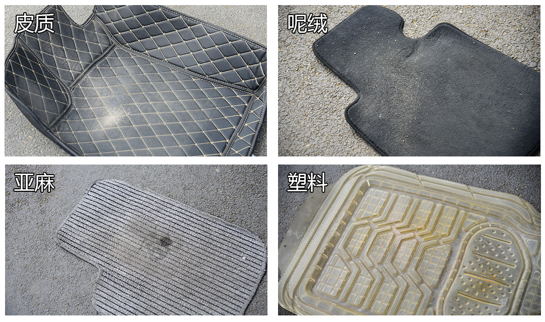 在城市中用车,脚垫面临最多的就是脚底下的灰尘,因此各种脚垫在撒上灰尘之后的显眼程度就很重要了,我们在每个脚垫上都撒上一定量的沙灰,观察每个脚垫的耐脏情况。