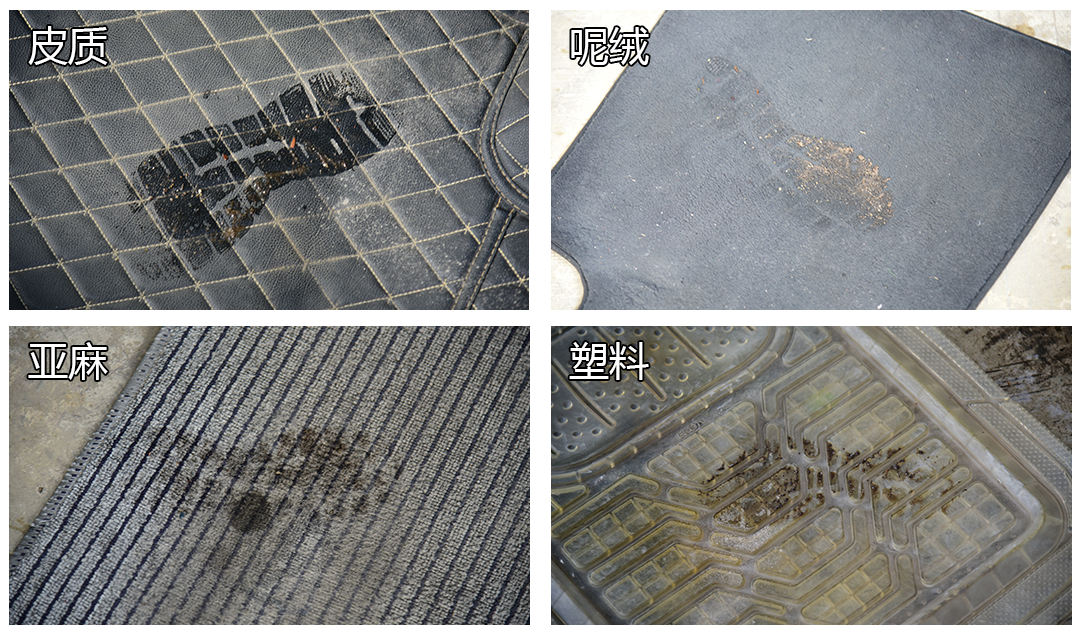 脚垫不仅常常面对灰尘,还需要面对下雨天的泥水,因此我们模拟湿地情况下的使用场景,用在泥水里踩踏过的鞋来对脚垫进行踩踏,观察每个脚垫的耐脏情况。