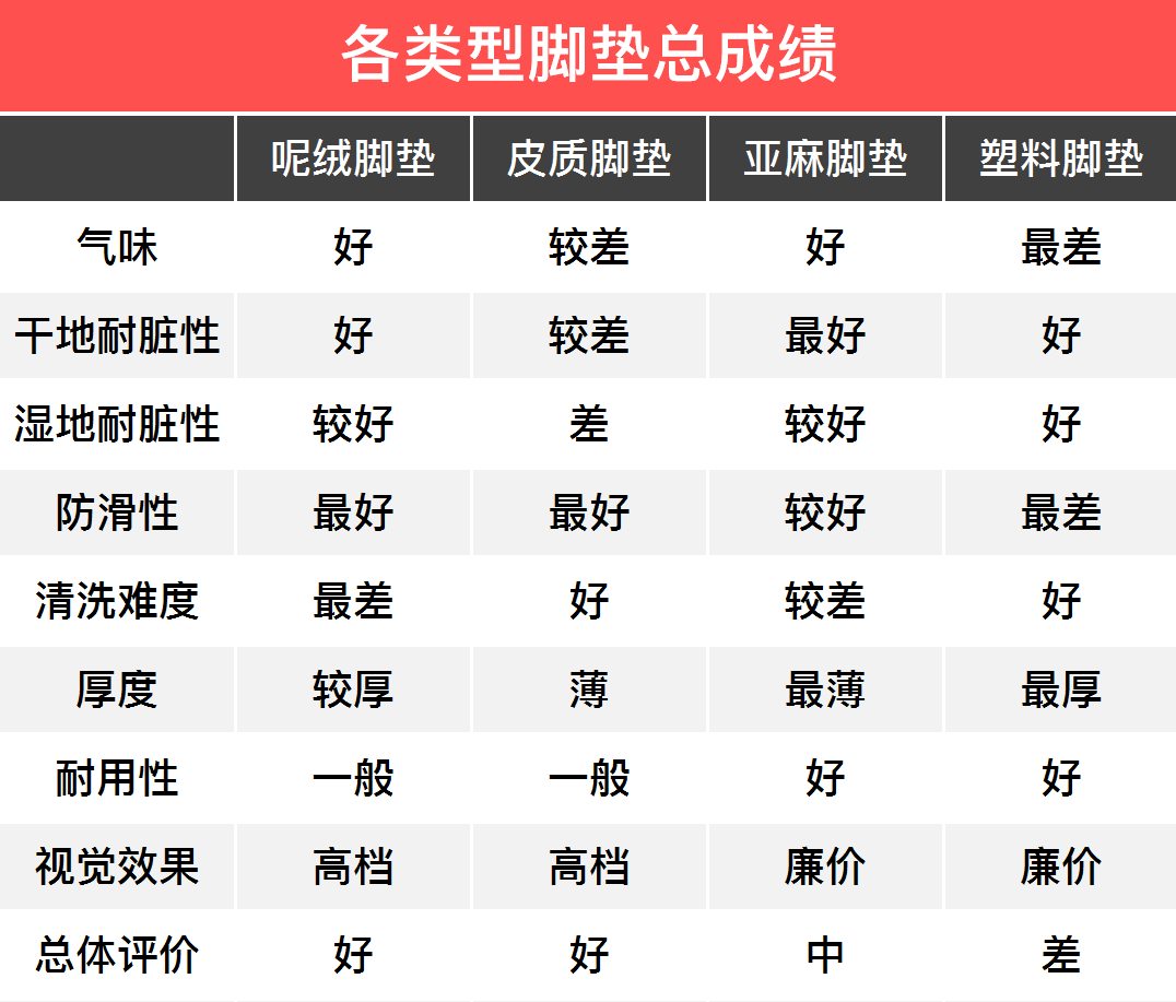 我们针对生活使用可能面对的各种需求,对这些脚垫进行了一个多项目的横评