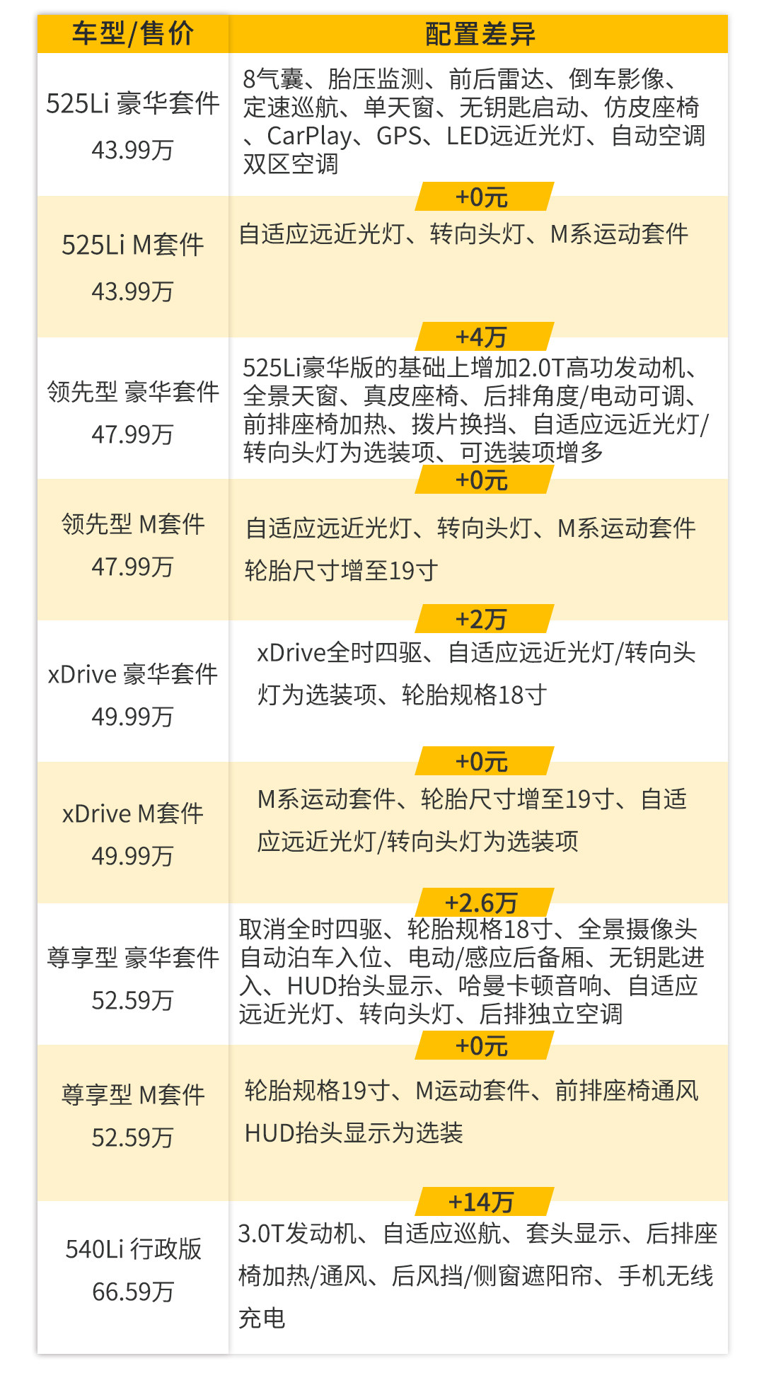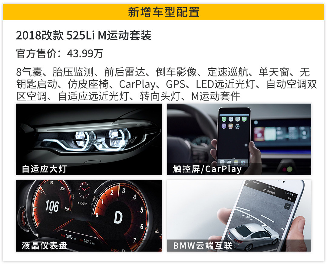 这次上市的重点车型在于最低配525Li,比取消了的528Li多了一些配置,包括:全液晶显示屏、CapPlay手机互联、中控屏从8.8英寸增至10.25英寸,M套件车型还多了自适应远近光灯和转向头灯,配置上增加的就大概是这些,和取消了的入门版车型相比,新的入门版车型价格下调了一万,只看配置的话减少一万还增加了一点配置,这入门车型还是挺有性价比的。