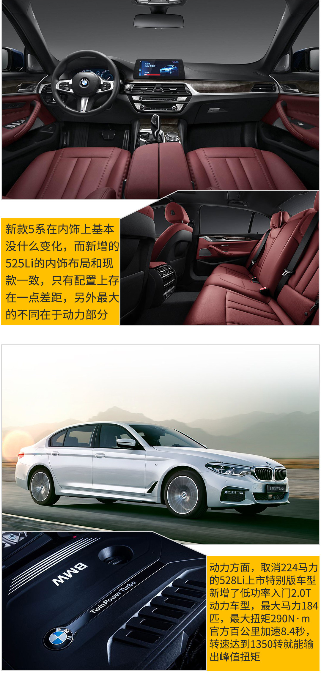 但是动力水平却下降了,从224下降到184匹,下降了足足40匹,官方百公里加速8.4秒,实测也是8秒出头,动力数据感觉还可以,但貌似跑不过思域。那到底值不值得?这得看你对动力有多大要求了,其实实测8秒这样的百公里加速已经不算慢了,况且新款的5系经过车身轻量化处理,即便是中大型车的身材也能跑出有这样的成绩,实属不赖,对于日常来说应该是足够的,如果你预算实在是差那几万,对动力的要求不是那么的高,那么525Li的配置真的是挺高性价比的,但如果换做是教授,砸铁卖锅也弄出4万来,上530Li,配置更高,动力充足,次低配性价比绝对杠杠滴。