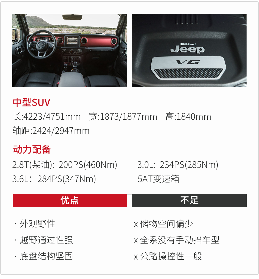 目前国内在售的牧马人有五款车型可选,其中我最推荐的还是3.6L的两门舒享版。两门的造型使其车长仅有4223mm,较好地保证了越野时的灵活性。而3.6L V6自吸则可以帮助驾驶员更精准地控制油门,5AT变速箱的换挡也还算平顺。