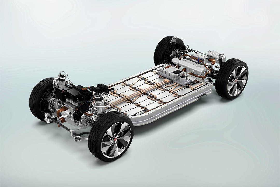 虽然是一款纯电动车,但依然摆脱不了铝合金的加持。捷豹I-PACE的车架采用专门定制的EV铝结构,拥有36kNm/度的抗扭转刚度。在前后轴都分别配备了一台电机,电池位于前后轴正中心,从而实现四轮驱动。