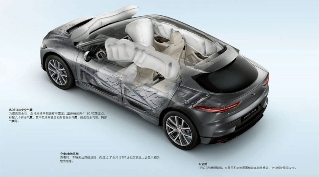 这么快的纯电动SUV,肯定也要开起来安全才行,在主被动方面,捷豹I-PACE在前排引擎盖区域设置了可以展开的行人安全气囊,在时速低于20km/h时会提醒前方路人有车经过。自适应巡航,车道保持,防碰撞等安全配置也都会有。