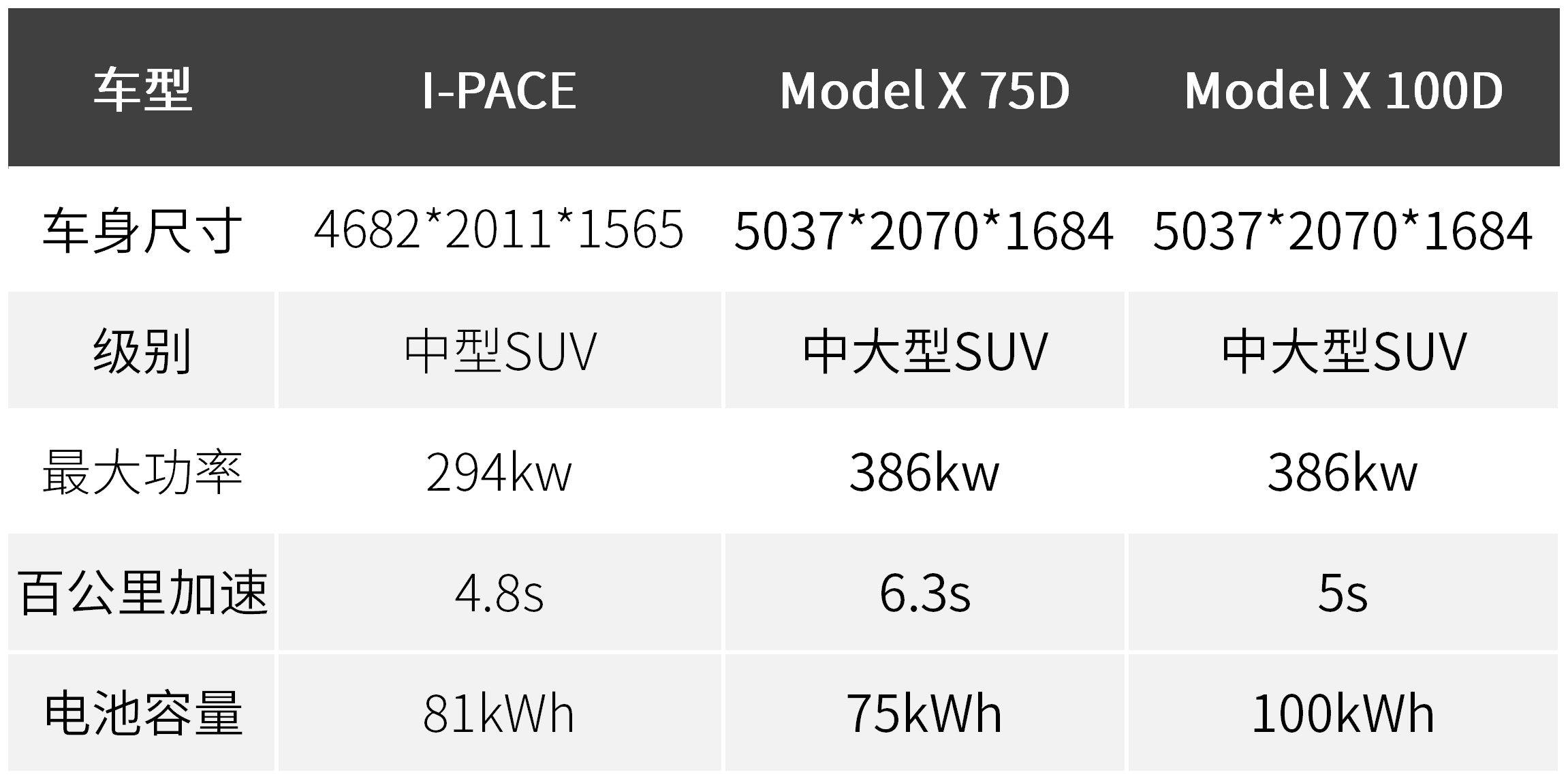 在我对这两台车的数据对比了之后,也许知道了个大概。特斯拉Model X 75D电动机总功率386千瓦,捷豹I-PACE电动机总功率296千瓦,如果你单纯看动力参数的话,你也会像我一样觉得特斯拉Model X 75D会赢。虽然在网络上捷豹I-PACE和特斯拉Model X都没有公布车重,但是根据车身尺寸来看,Model X属于中大型SUV,捷豹I-PACE属于中型SUV,在车重上I-PACE自然轻很多,再加上自家的轻量化设计和低风阻参数,要赢其实并不难。
