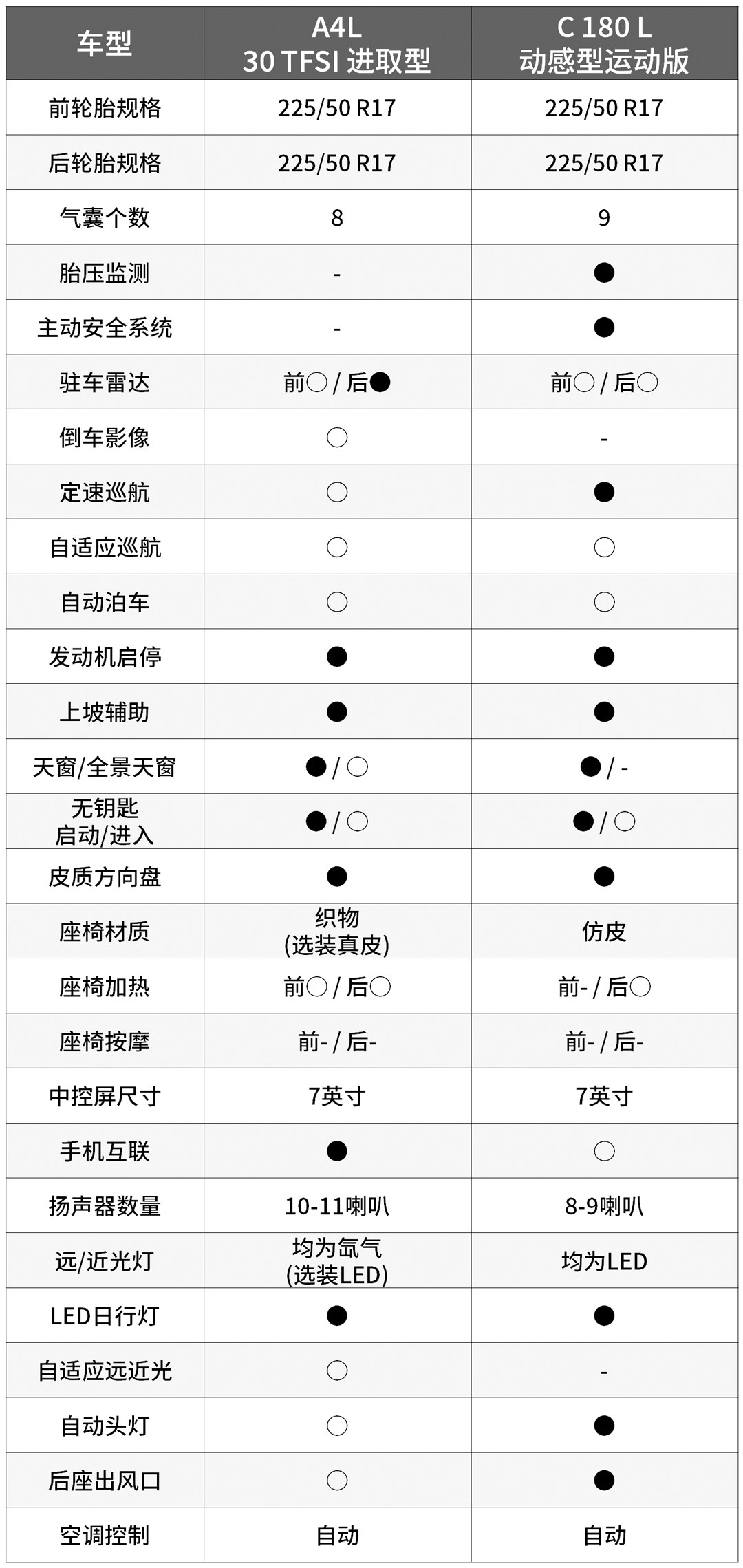 配置方面,安全配置两车都有足够的保证,毕竟怎么说都是豪华品牌的车型,而奔驰即使是最低配都有配备了膝部气囊和主动式辅助安全系统,相对来说安全配置更充足,也比A4L多了定速巡航和上文提到的自动大灯、感应雨刮等配置,相对来说C级的配置更丰富。