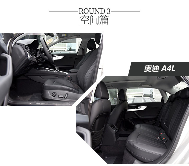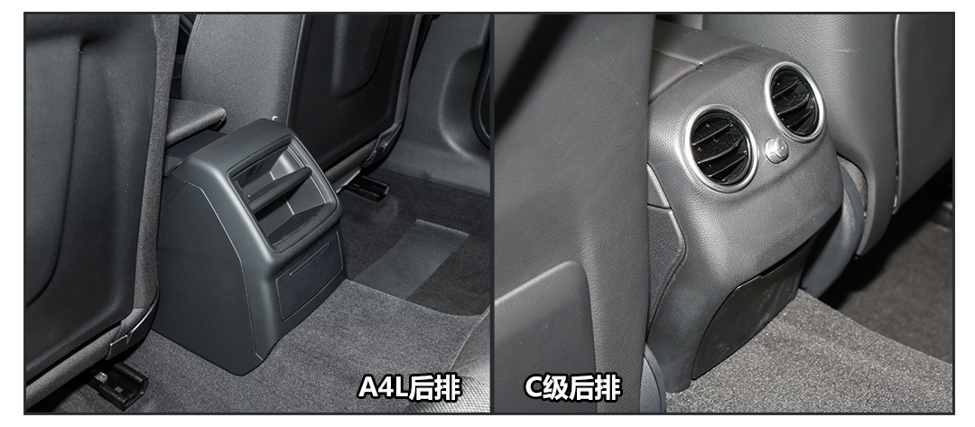 空间方面,其实两款车在乘坐空间方面都是无需担心的,都是经过加长的车型,实测数据两者相当,但是A4L稍稍好一点点;另外值得注意的是A4L后排并没有出风口,只有两个储物格,而奔驰后排出风口是标配的。