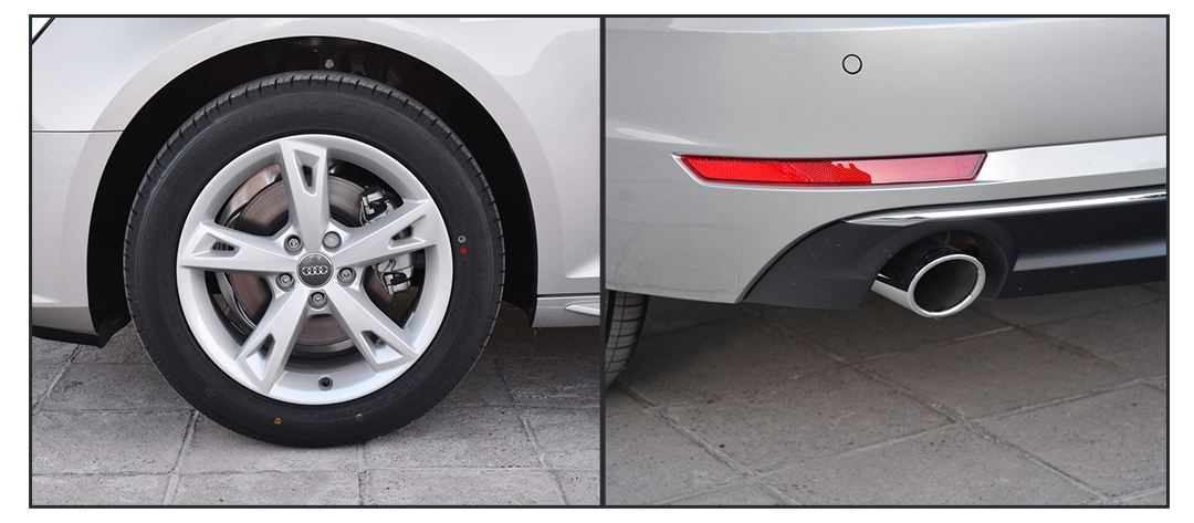 轮胎规格和A4L一样是225/50 17寸,不同的是轮毂形状金属感更强,视觉效果更好,而且排气是双边共双出,并且两边都是真的。