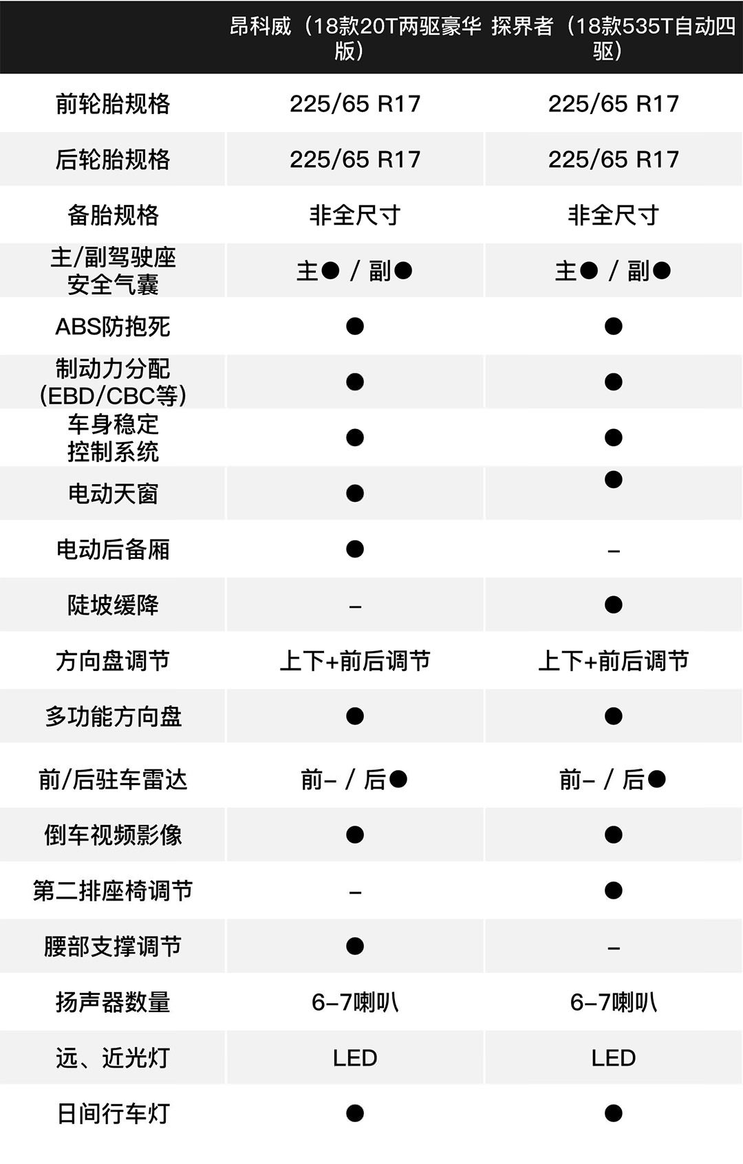 在配置上两款车都是比较丰富的,可以说不相上下。唯一不同的是探界者多了第二排座椅调节和陡坡缓降功能;而昂科威则多了腰部支撑调节和电动后备箱。其中值得一提的是探界者在高配版车型中配备了智能全时四驱系统,可适时四驱行驶,但在售价方面比低配版车型仅仅贵了1万,性价比可以说相当不错了。