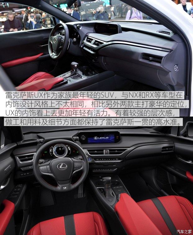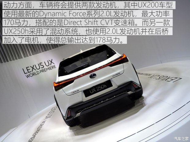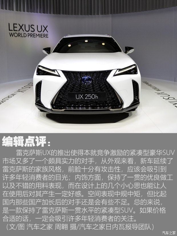 编辑点评:此次车展上发布的雷克萨斯UX可以说是即将进入国内的一款重磅车型,对于国内现有的豪华品牌紧凑型SUV来说,它的到来势必又会引发一场大战。作为一款全新车型,雷克萨斯UX的优势首先是纯进口身份,没有因为空间而牺牲原汁原味的设计,其次是品质感和设计元素比我们熟悉的那几个紧凑型SUV更有新鲜感,再来有是混动车对于燃油经济性的提升有着一定帮助。相信凭借这几点,UX到来后一定会有着非常不错的市场。