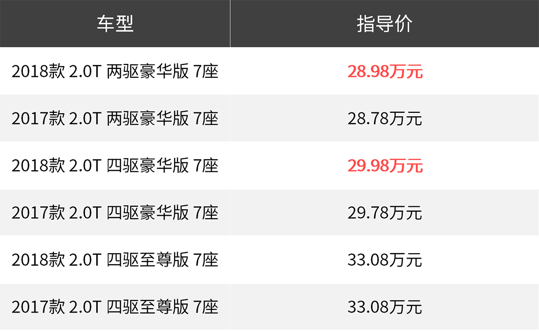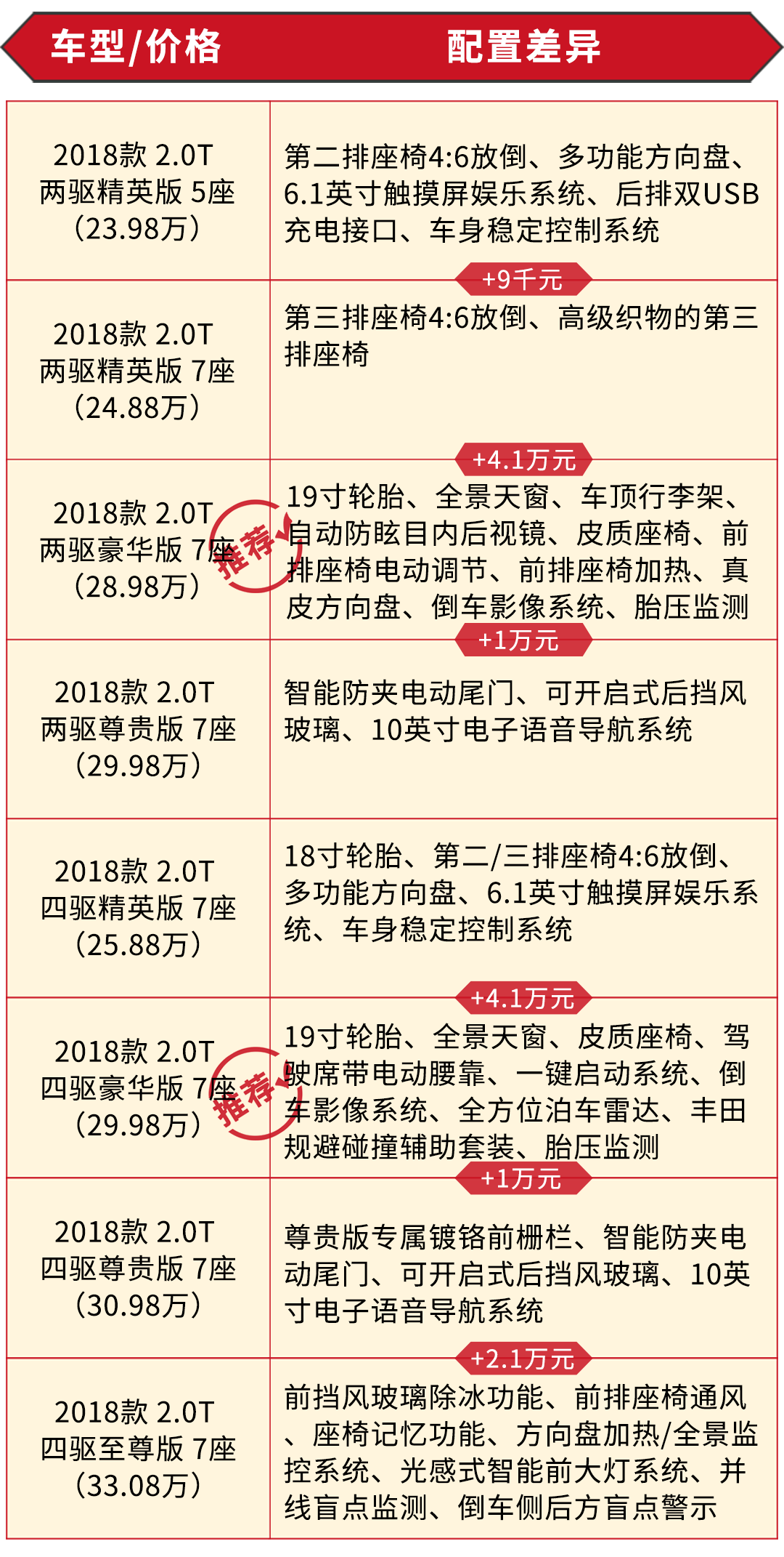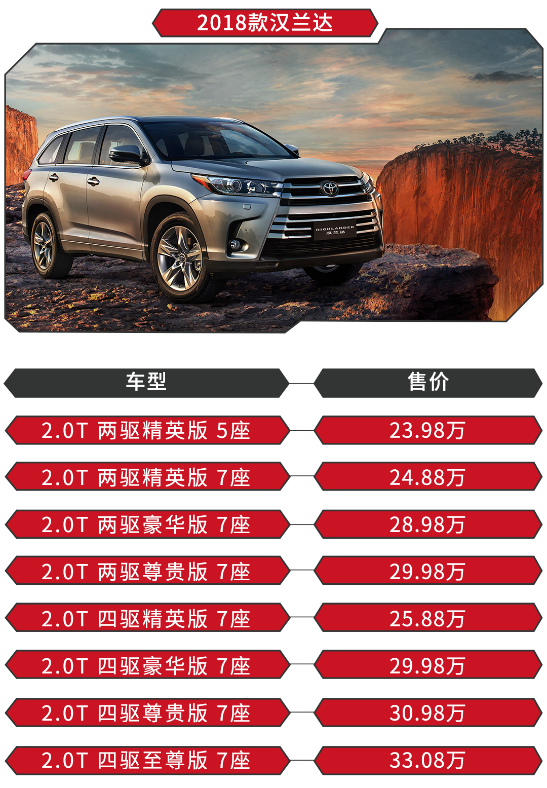 配置升级、价格不变,是各大车型改款的套路。2018款汉兰达也不免俗,指导价区间为23.98-33.08万,与2017款(纯2.0T车型)保持一致。但是不是真的价格完全没变呢?在这先卖个关子,下文揭分晓。