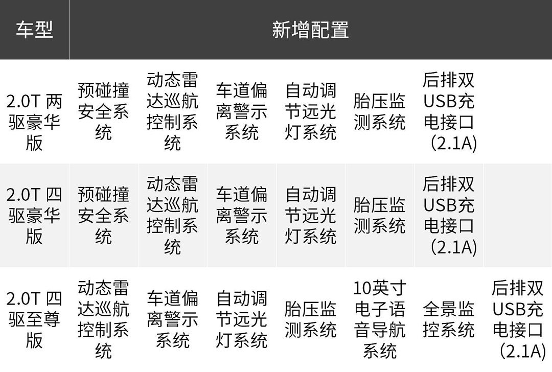 精英版车型不在这次增配的范围,两驱/四驱豪华版车型与四驱至尊版车型是这次增配的重点对象;而这次增加配置主要集中在安全配置方面。