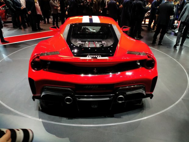 488 Pista在车身方面比起488GTB减重90kg,整车质量仅1280kg。动力方面,这台装在Pista上的3.9L双涡轮V8发动机拥有最大720匹马力,比488GTB多出了整整50匹,是目前法拉利旗下最强的V8发动机。