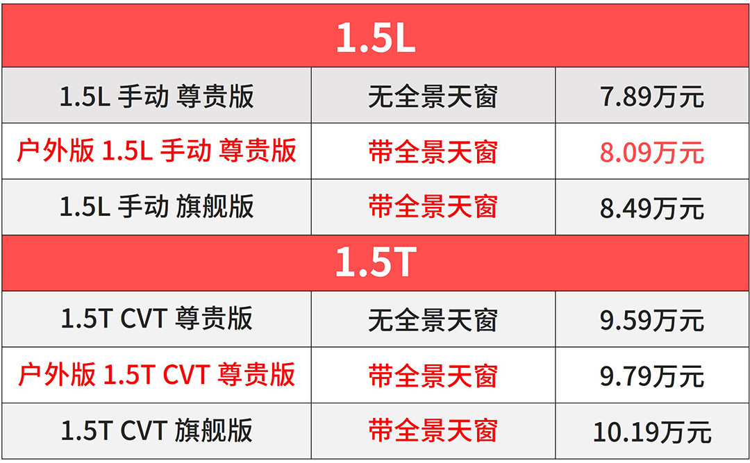 东南DX3户外版提供两款车型可供选择。一款为1.5L配手动变速箱的车型,一款则为1.5T配CVT变速箱的车型,价格分别为8.09万元和9.79万元。这个价格区间在1.5L和1.5T车型里面属于次高配档次。不过户外版车型均标配全景天窗(原来只有顶配提供),算是这个车型在配置上的最大卖点之一。