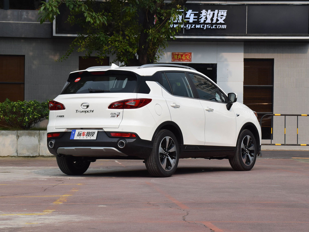 车身尺寸相比同级别的宝骏510和哈弗H2s等主流小型SUV,传祺GS3有一定的优势,悬浮式的车顶也是时下流行的设计元素之一。车尾的设计是GS3区别于家族车型最重要的元素,“8”字型的尾灯在晚上很有辨识度,后杠上的两个大排气管装饰很抢眼,但真正的单边单出排气管隐藏在车底。