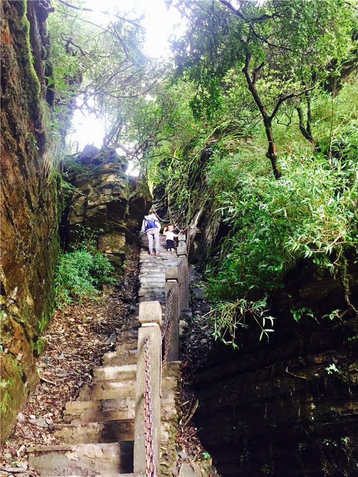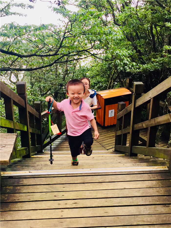 即便坐了索道,爬山的路依然漫长。一路上圈圈都很勇敢,下了索道,也没太多废话,一路健步如飞,自己一个人吭哧吭哧爬到了老金顶。常人不到两个小时的山路,我们爬了近三个小时,这该是圈圈人生中第一座独立登顶的山峰了,事实证明,只要他想走,还是可以跑得很快滴。一路上游人纷纷点赞,都问他几岁了,圈圈会很自豪的告诉大人:三岁。其实,下个月圈圈才满三岁呢。爬山的路上,也不知什么原因,圈圈又哭又闹不肯走,圈圈妈故技重施拿出一根棒棒糖,没想到圈圈哭得更厉害了,大声哭道:“放起来……我不要……有猴子……”。哈哈,一个熊孩子。
