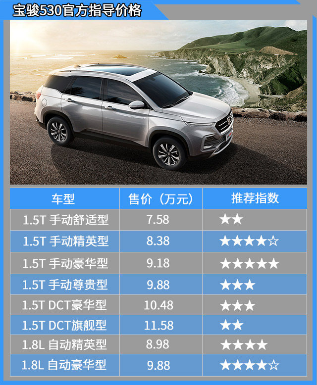 宝骏530售价7.58-11.58万,这个价格非常良心,延续了宝骏品牌一贯的高性价比的特点。现在至2018年3月31日前到官方注册的用户能够领到一张购车券。此外,即日起到2018年4月30日,用户购车可以享受18期0利率和5000元置换补贴。