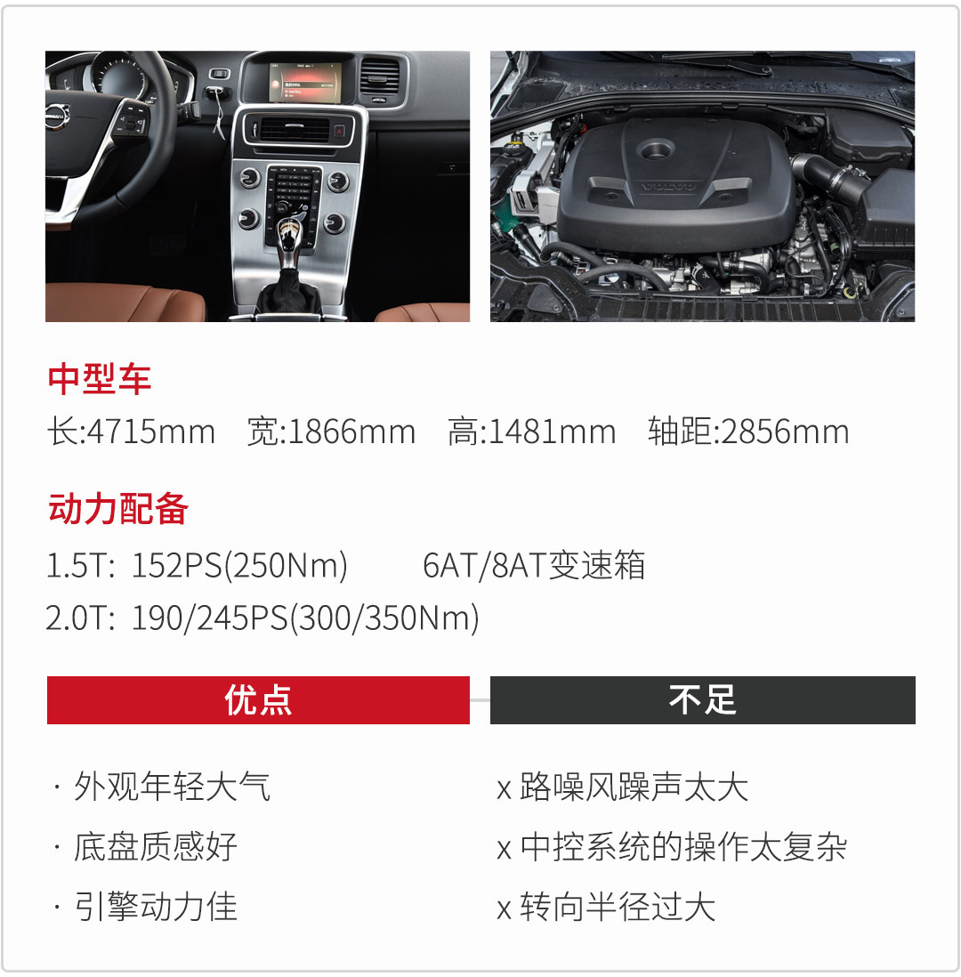 沃尔沃S60L是沃尔沃亚太公司出产的一款中型轿车,方向盘造型稳重,真皮质感带来较好的手感,不足点之处在于方向盘自动回正功能过于灵敏,稍微一转向松手立刻就回正。动力搭载上低功率2.0T和1.5T均匹配6AT变速箱,而在高功率版本2.0T则搭载8AT的变速箱,在换挡上,8AT的存在感会比较弱一些。
