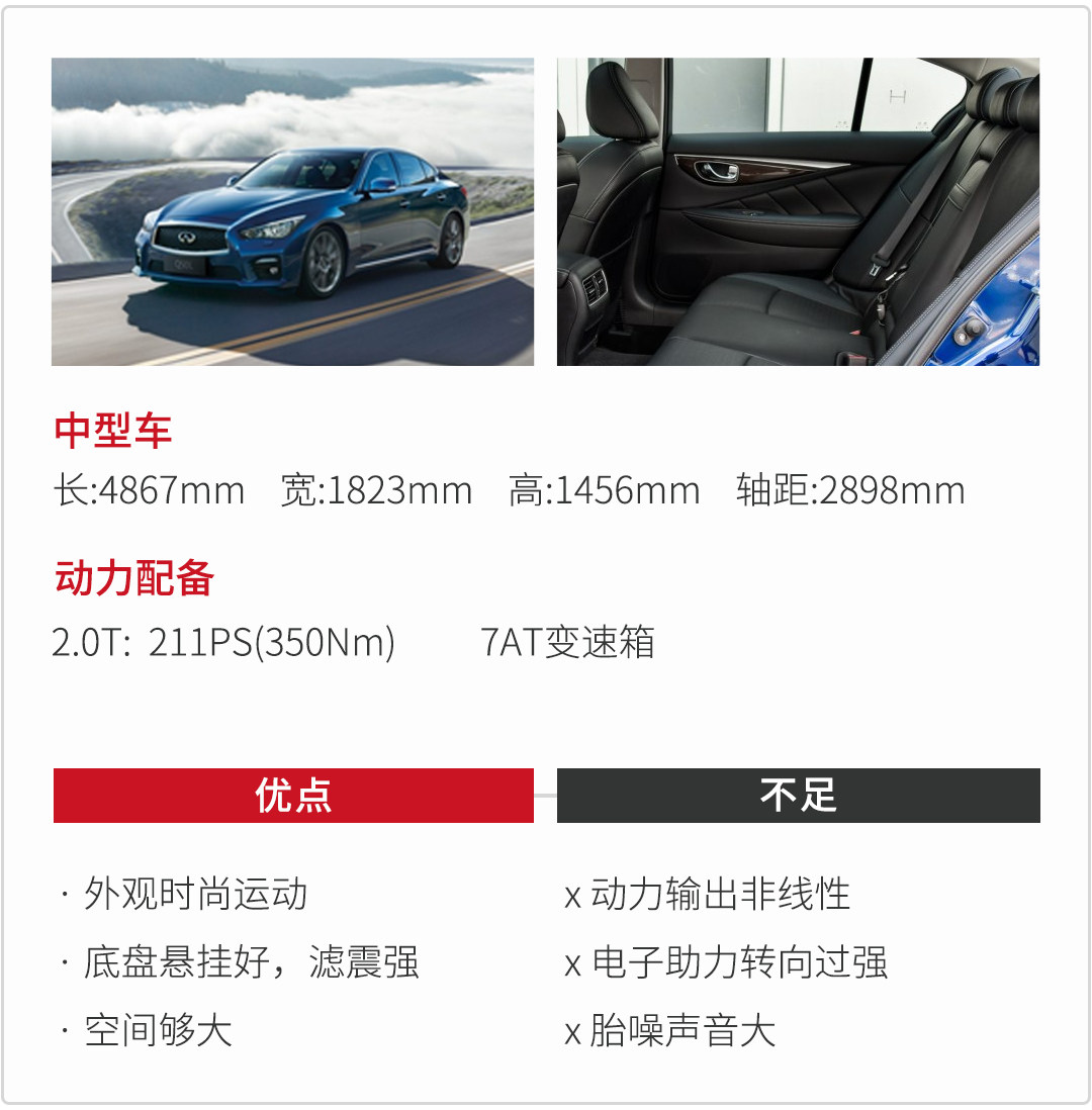 在动力方面,Q50L搭载2.0T+7AT的动力组合,最大功率211KW,峰值扭矩350牛.米。此动力搭配在同级的动力组合中是很少见的,而且因为Q50L的动力调校为非线性,所以在输出方面踩轻了油门不会动,而踩重了车可能会往前蹿,所以刚接触新车时需要一定的时间来适应。不过,在底盘调校中Q50L有着不错的表现,使用前双叉臂后多连杆悬架系统在通过坑洼泥地时车会比较平稳,颠簸程度较轻。