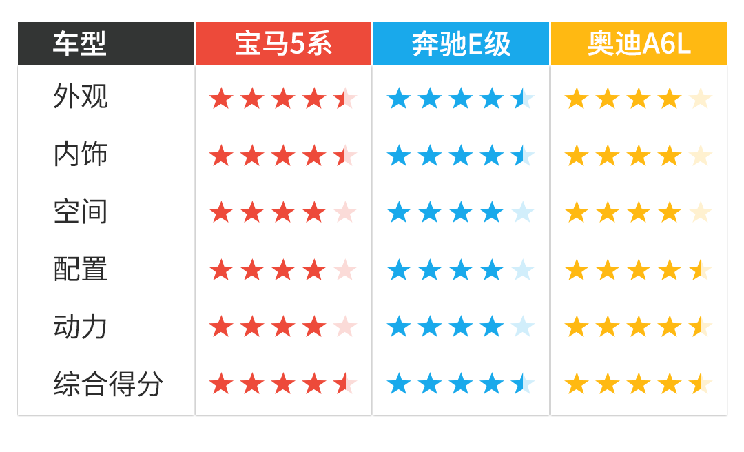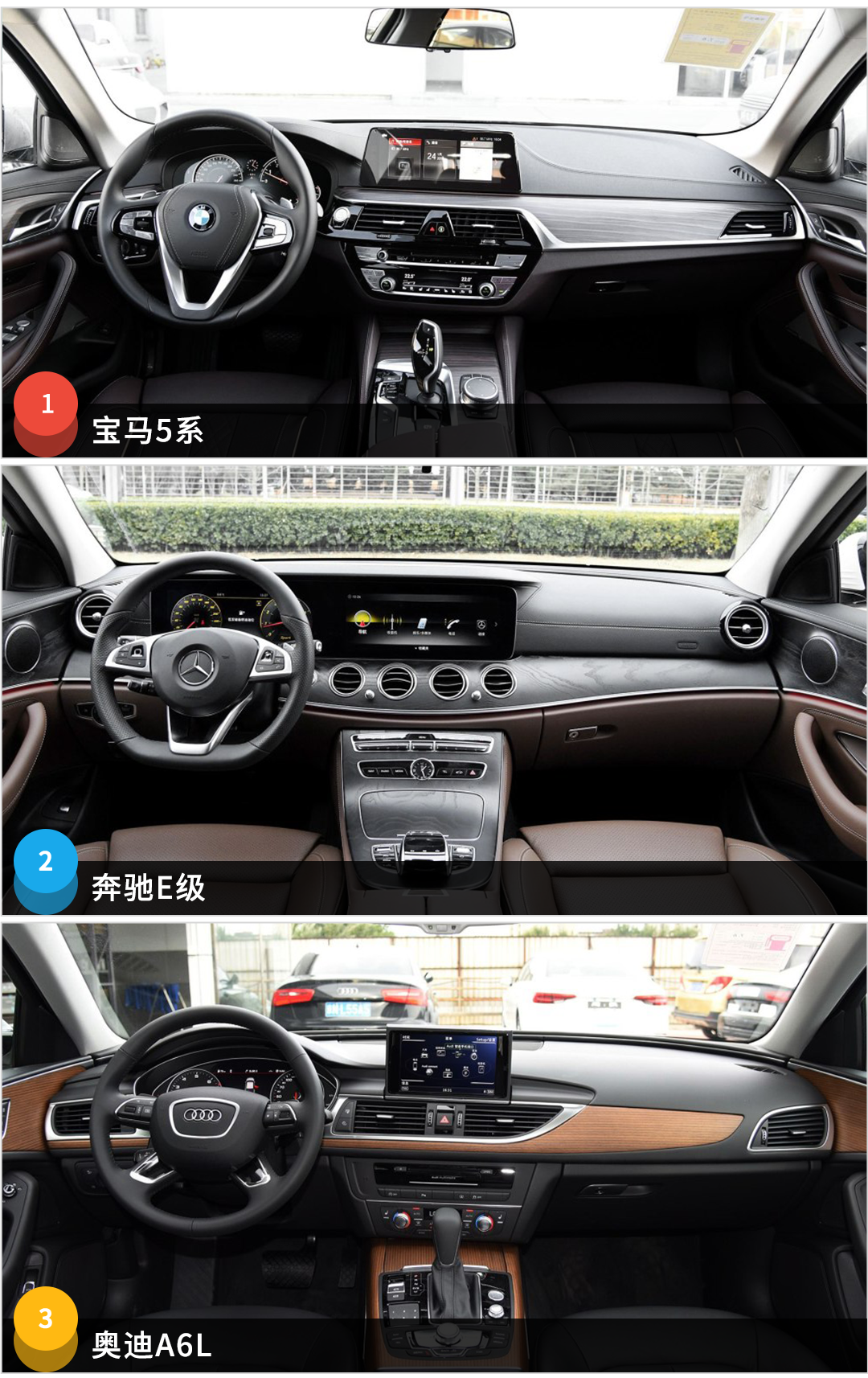 宝马5系被传为中大型豪华轿车的新标杆,而奔驰E级依然有高水平的做工质感和奢华感,两者之间各有高低。而现款奥迪在技术水平和噱头方面相对差一点,但它有自己的优势:便宜!买车这种事情,不求最好,但求合适!
