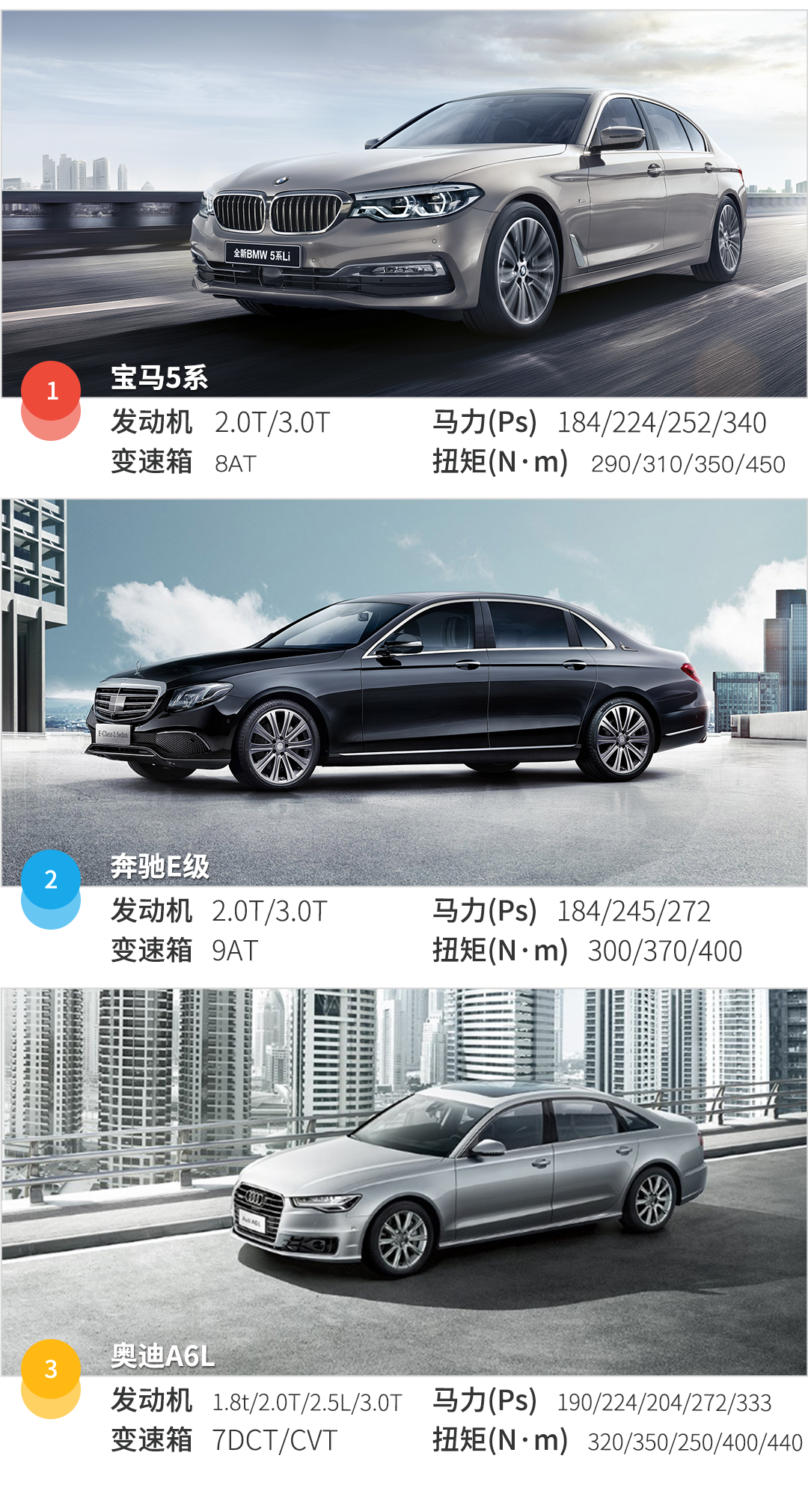 如果预算50万左右选车,那么奔驰宝马这两边能选到搭载2.0T(高功率)的E级和5系,而奥迪A6L这边能选择搭载3.0L机械增压车型。在动力输出上面,奥迪A6L绝对是全面压制宝马5系和奔驰E级。