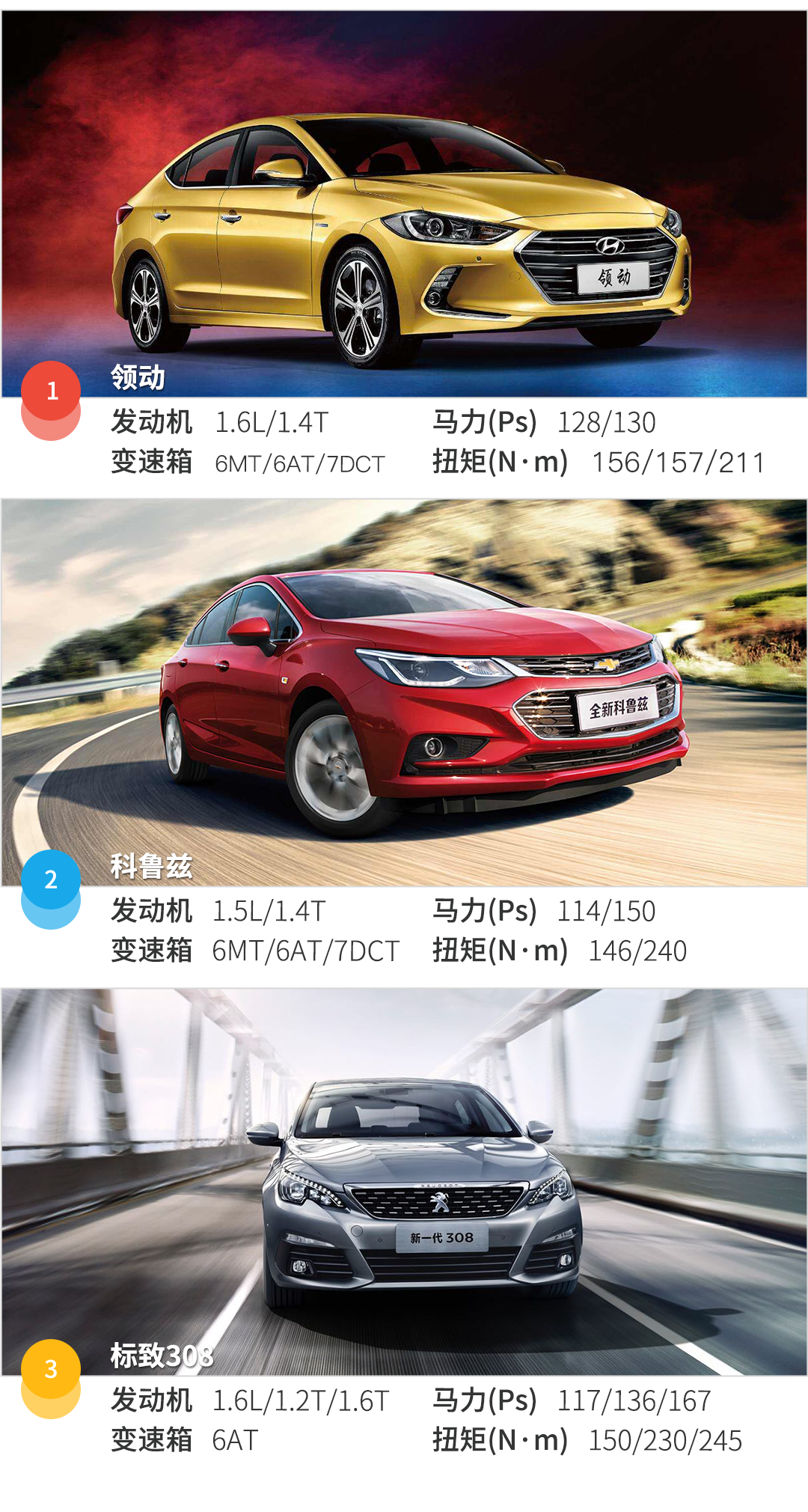 三款车的热销车型都是自然吸气版本,而且是自动挡居多。从动力参数上看,领动的1.6L发动机有很大的优势。而在实际试驾过程中,领动的动力表现确实不错。标致308的1.6L发动机虽然动力参数较差,但油门响应速度还挺快的。