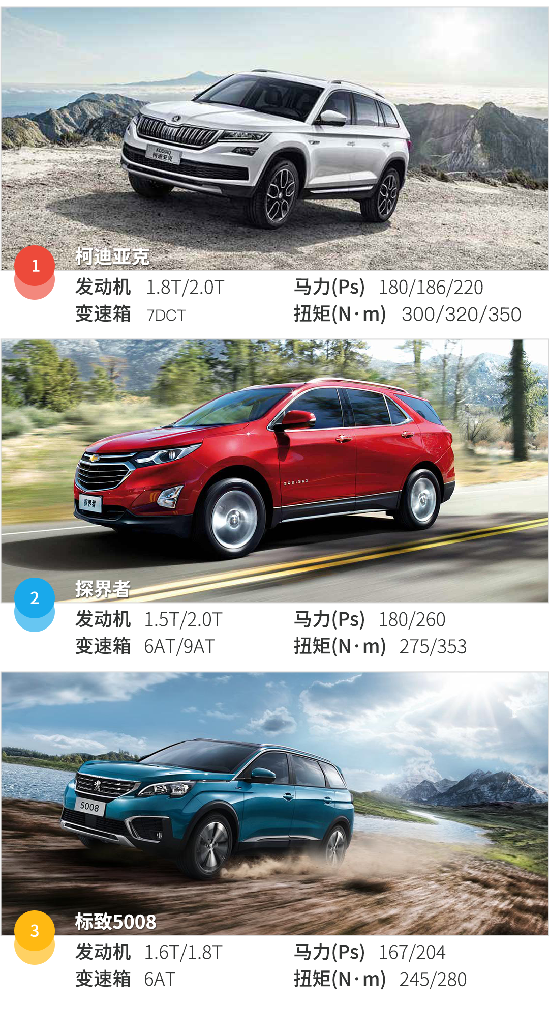 标致5008的发动机在调校方面同样比较保守,马力和扭矩的参数都比较差,实际驾驶当中的动力表现的确很一般,而且标致5008的变速箱表现在三款车当中算是挺差的了。表现最好的是柯迪亚克,整个行驶质感最好的也是它。
