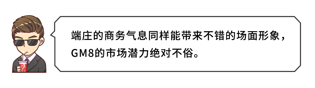 GM8从命名上都能让人与GL8产生联想,而从功能性上,GM8同样也一定程度上有与GL8相互博弈的实力,中排独立的座椅彰显着尊贵的商务气质,而双向侧滑电动车门的设计不仅保证了档次感,同时也增加了使用便利性,车内配置虽然称不上面面俱到,但是细节处的设计可以说考虑得还是比较周到的;商务属性中绝对占据重要性的舒适感,GM8可以说非常到位。