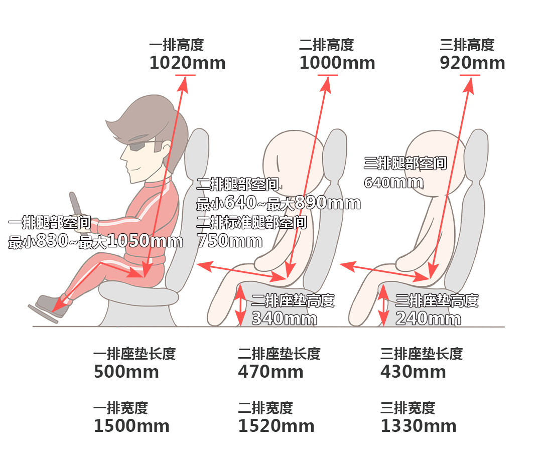 前后座椅经178cm测试者测试头部和腿部都有较大的空间盈余,乘坐空间都很宽敞。另外7座型第二排的座椅仅靠背可调节而不能前后调节,如果乘客要进入第三排会显得较困难;还有经测试在保持一二排的位置时第三排座椅头部空间有多,但是腿部空间就会直接顶在第二排座椅上。