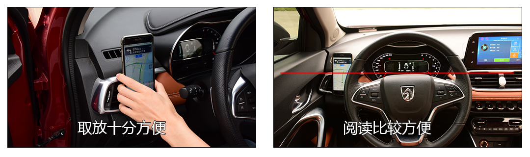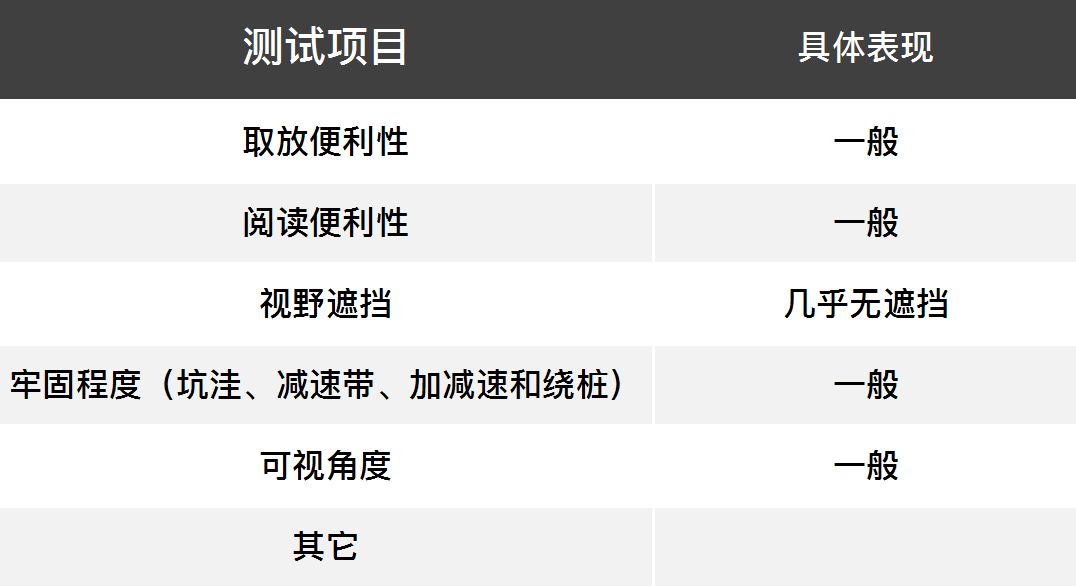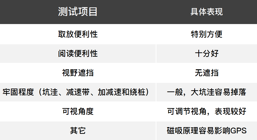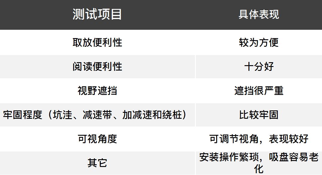 备注:每款支架我们都选择最适合我们的展示车宝骏510的安装位置,从拿取便利性、阅读便利性、视野遮挡、牢固程度、可视角度和其它因素来综合考量各款支架,给出推荐指数。其中牢固程度通过减速带测试和绕桩测试、加减速以及坑洼路段测试。