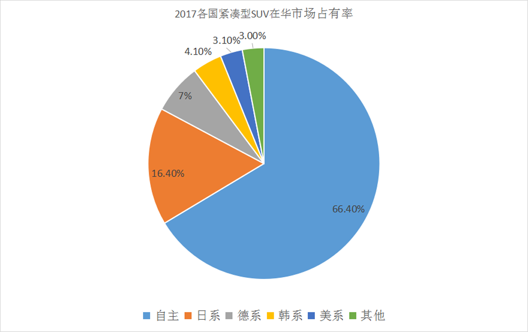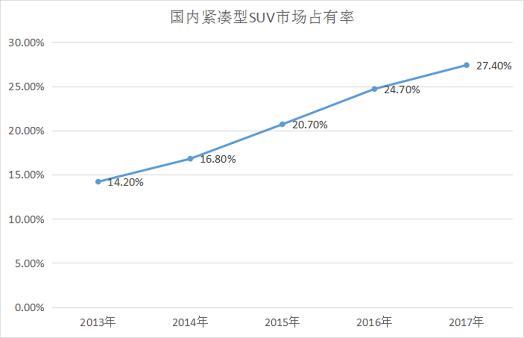 市场占有率同样一路飙升,从13年的14.2%慢慢升到17年的27.4%,也不知何时到头。在这股增势中,受益最大的就是自主紧凑型SUV,足足占据了66.4%的销量份额,远远甩开排第二的日系车型。