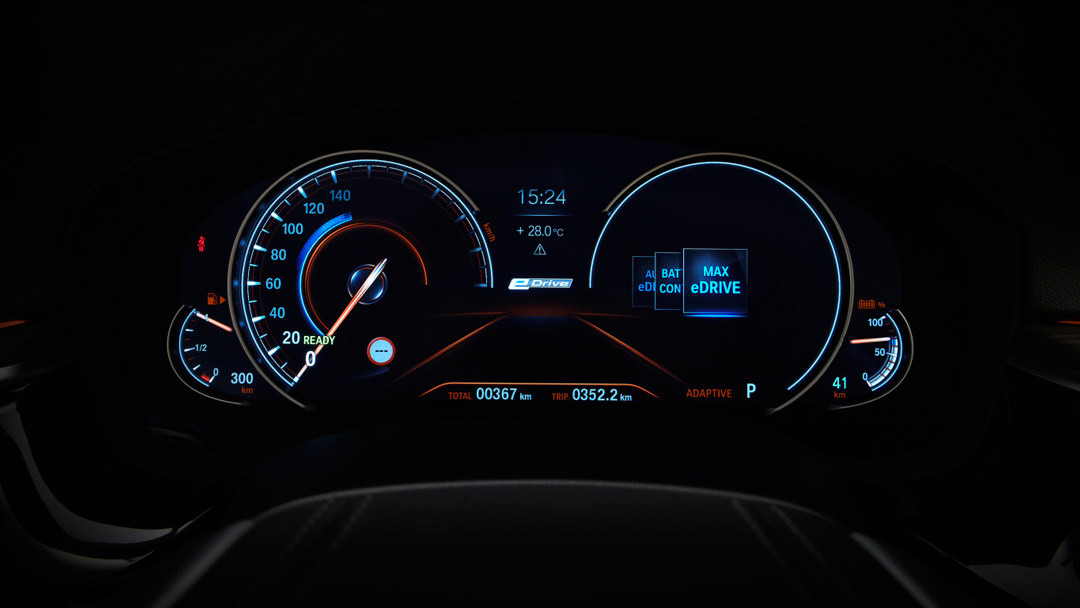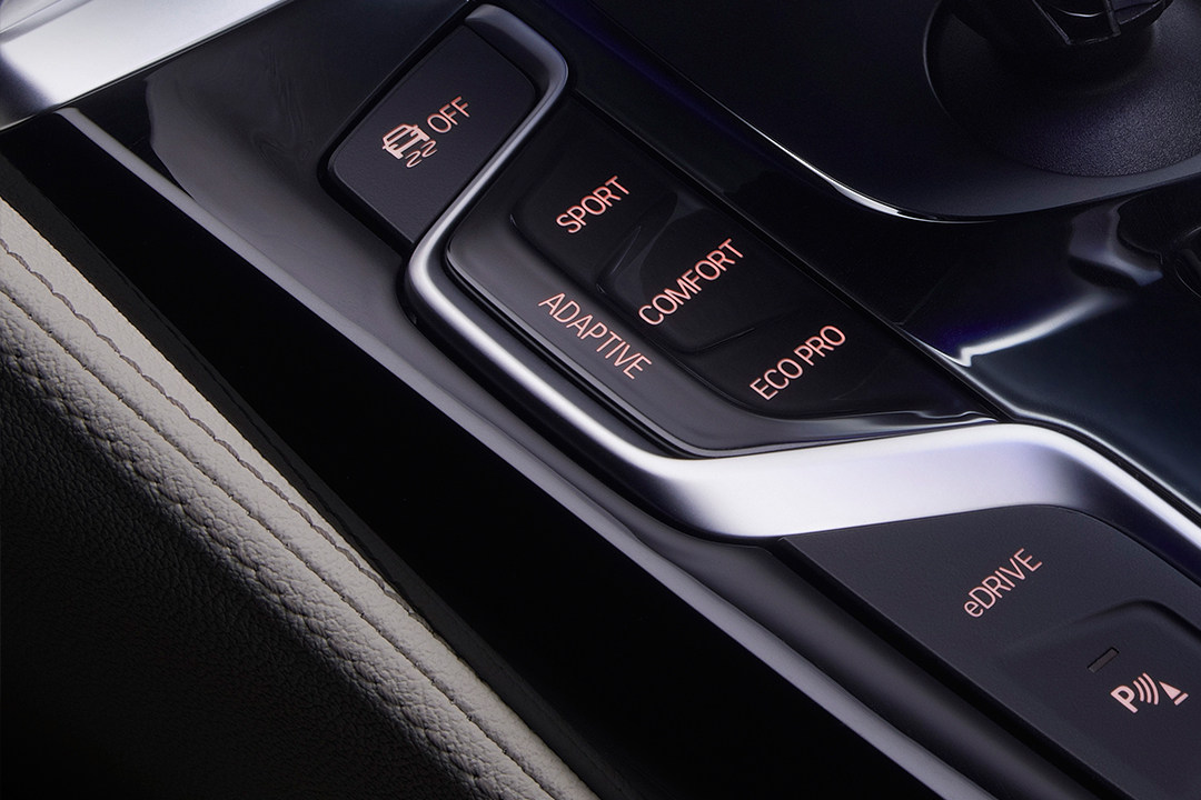 eDrive的三种驾驶模式下均可以分别选择上方的SPORT、COMFORT、ECO PRO模式,也就是运动、舒适以及节能,三三得九,再加上ADAPTIVE,汽车会自动识别学习驾驶员的驾驶习惯从而调整出适合的驾驶模式,单单eDrive就超过十种驾驶模式了,再加上把档杆向左拨动切换到手动模式,则是发动机优先启动,再加上SPORT、COMFORT、ECO PRO……